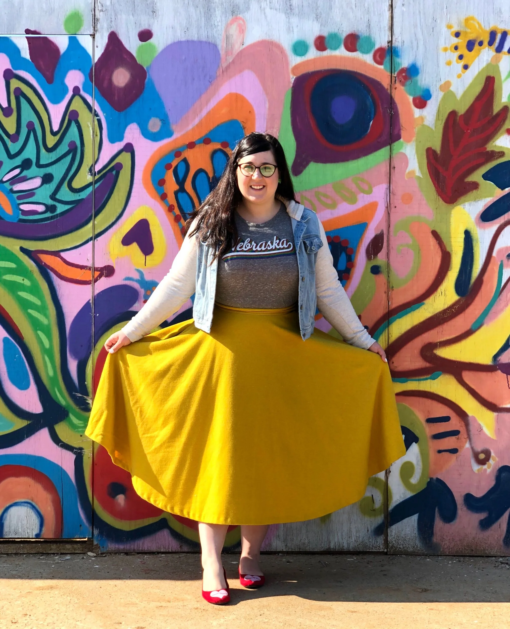 In front of a construction site mural, Denton, Texas
